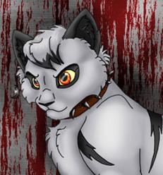 серый кот с чёрными полосками, хвостом и чёлкой. чёлка короткая и рваная. глаза небесно-голубые, без зрачков. |